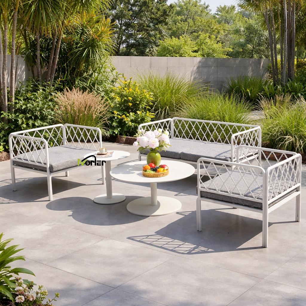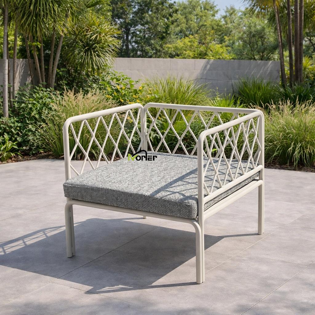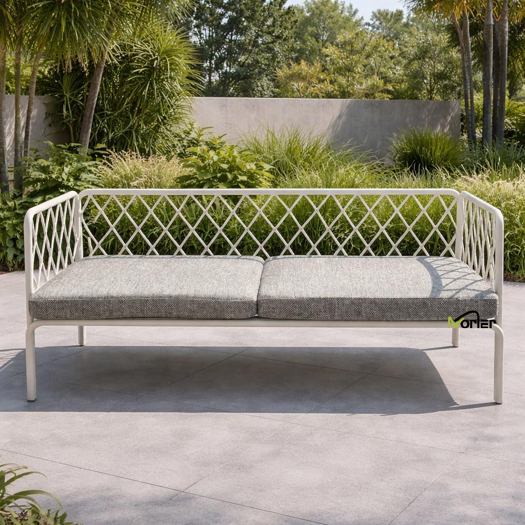 Этот современный уличный диван отличается чистым и минималистичным дизайном с металлическим каркасом красивой геометрической формы. Открытая решетчатая структура создает легкий и элегантный внешний вид, сохраняя при этом прочную структурную поддержку.